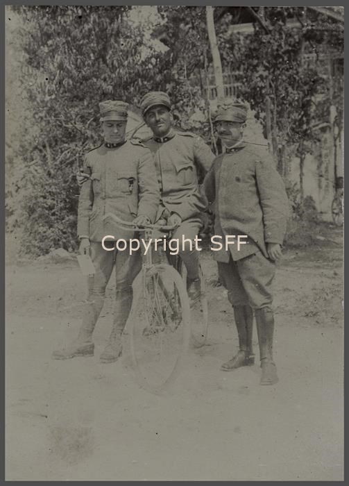Il S. Tenente XXX in sella alla bicicletta, ritratto accanto ad un suo commilitone e a un sottotenente del corpo sanitario militare.