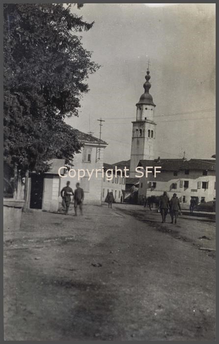 Il campanile e la piazza principale del paese di Capriva dove nell’ottobre del 1915 la 7^ Batteria someggiata stabilì la sede del proprio comando.
