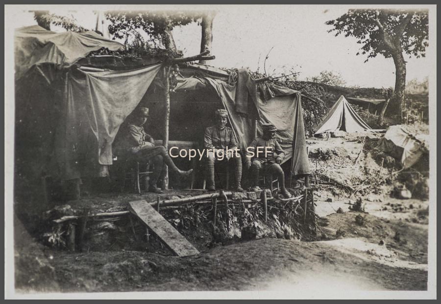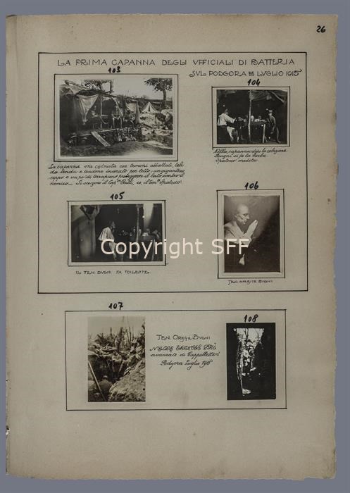 Il ricovero degli ufficiali della 7ª Batteria Someggiata, era costruito con tronchi abbattuti, teli da tenda e tendone incerato per il tetto. Seduti all'esterno sono ritratti il Cap.no Gatti, il Ten.te Bugni e il Ten.te Spatocco ripresi nei momenti di vita quotidiana negli accampamenti militari sul Monte Calvario [Podgora] nell'estate del 1915.