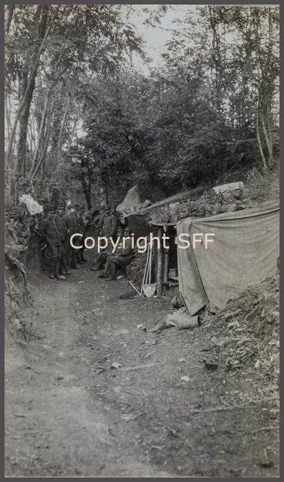 Soldati della 7ª Batteria Someggiata ritratti nei pressi dei ricoveri dove stanziano sul Monte Calvario [Podgora] nell'estate del 1915. Il ricovero ospitò nel mese di dicembre dello stesso anno anche Oreste Bugni.