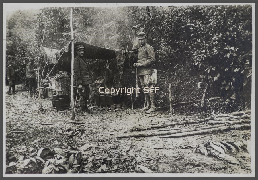 Gruppo di soldati dalla 7^ Batteria sulle colline antistanti il Monte Calvario [Podgora] , benché schierata accanto ai fanti della brigata Casale (11°e 12° reggimento fanteria), la 7^ Batteria era dotata di propri servizi come ad esempio: la cucina. Si notano le casse di cottura che venivano trasportate dalle retrovie.