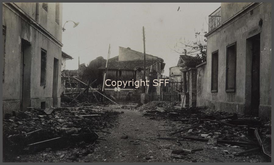 Case bombardate verso la fine del paese di Lucinico, riprese nel luglio del 1915, in prossimità del passaggio a livello sulla ferrovia per Gorizia