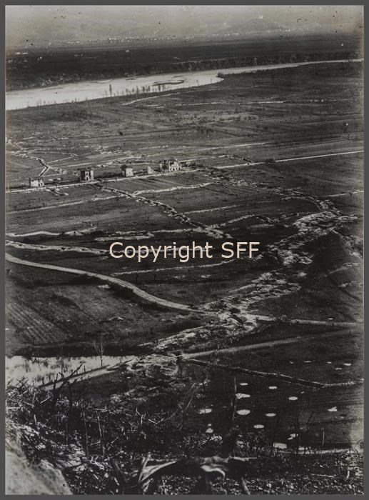 Panorama ripreso dal Monte Calvario [Podgora]. La pianura solcata da due ordini di trincee parallele, il fiume Isonzo, la strada Mainizza e sullo sfondo il Vallone, il fiume Isonzo e il colle di San Grado di Merna con il santuario ancora integro.