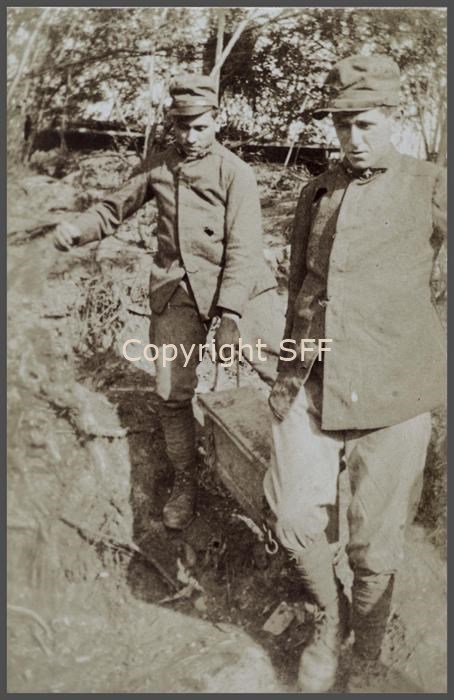 Mariani e Cappelletto trasportano le cassette munizioni per il rifornimento dell'accampamento militare (7ª Batteria Someggiata)sul Monte Calvario [Podgora] durante l'estate del 1915.