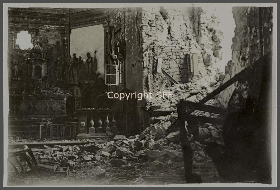 Interno della chiesa di Mossa danneggiata dai bombardamenti