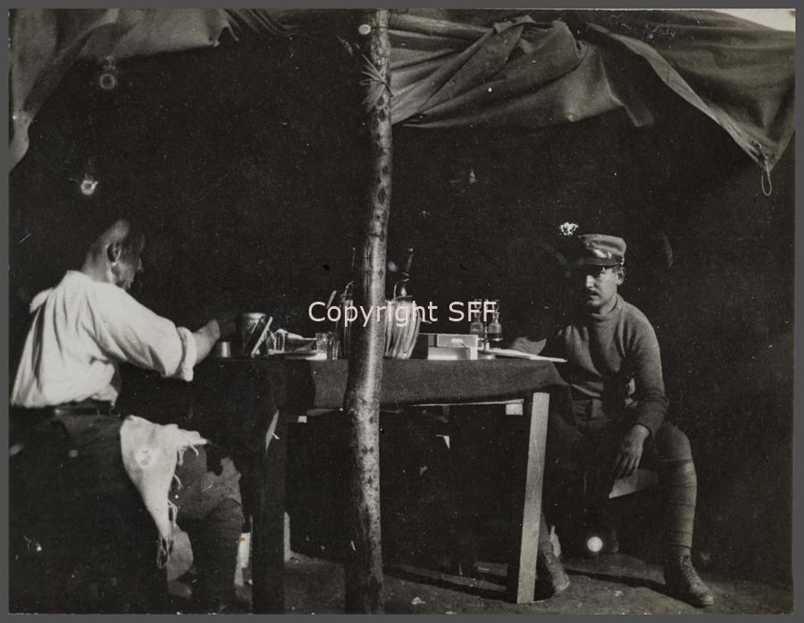 Il Ten.te Bugni, mentre si fa la barba, e il Ten.te Spatocco seduto di fronte vengono ritratti dopo la colazione nel ricovero degli ufficiali della 7ª Batteria Someggiata dell'accampamento militare sul Monte Calvario [Podgora] nell'estate del 1915.