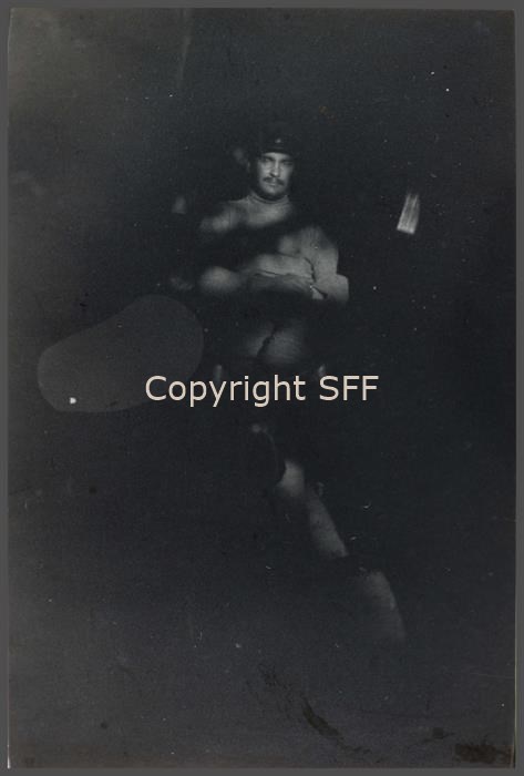 Ritratto del Ten.te Giuseppe Spatocco ripreso nella galleria scavata poco distante da dove sorgeva la prima capanna degli ufficiali degli accampamenti militari della 7ª Batteria Someggiata sul Monte Calvario [Podgora] nell'estate del 1915.