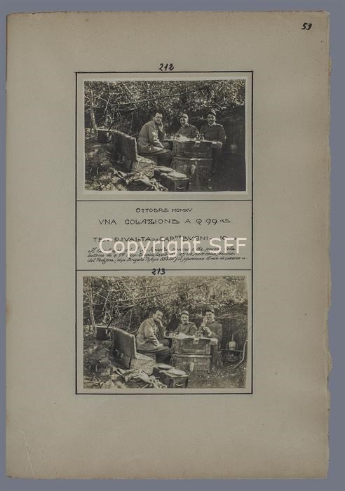 Il Capitano Bugni ed il Tenente Rivalta appartenenti alla Batteria della Brigata "Casale" 11° e 12°. a colazione con S. Tenente XXX Brigata "Pistoia" 35° e 36° sezione del Podgora, a quota 99 li separano 15 minuti di cammino.