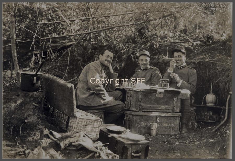 Il Capitano Bugni ed il Tenente Rivalta appartenenti alla Batteria della Brigata "Casale" 11° e 12°. a colazione con S. Tenente XXX Brigata "Pistoia" 35° e 36° sezione del Podgora, a quota 99 li separano 15 minuti di cammino.