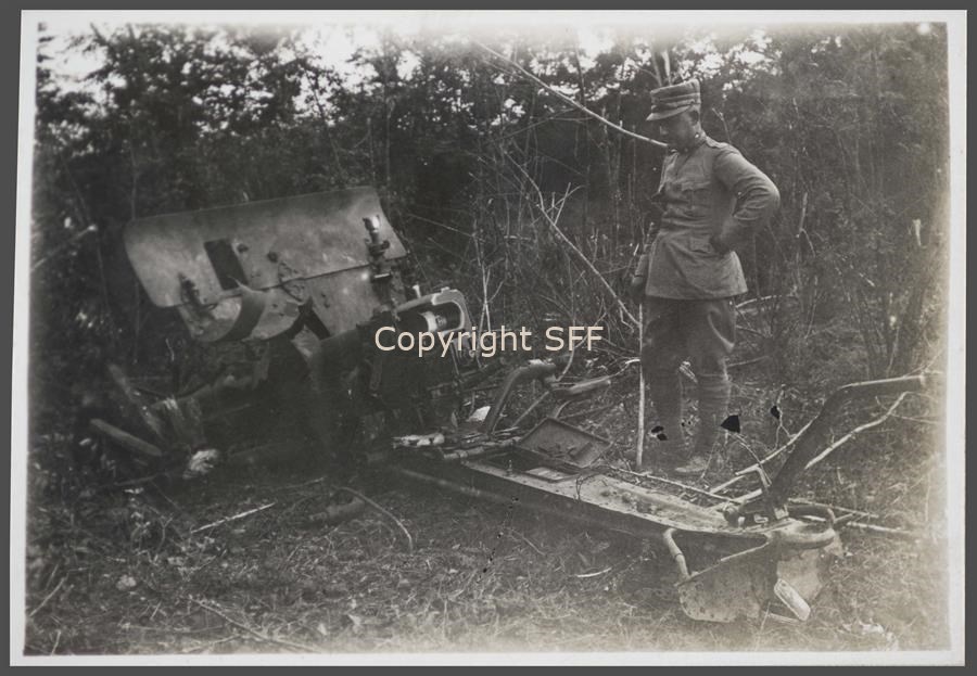 Il S. Ten. Spatocco ispeziona un cannone da 75 colpito nei pressi della campagna di Lucinico