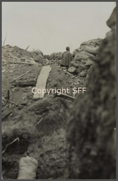 Un soldato avanza tra la trincea italiana, in prima linea. In lontananza i cavalli di Frisia metallici a snodo segnano la trincea austriaca sul Monte Calvario [Podgora] nel novembre del 1915.