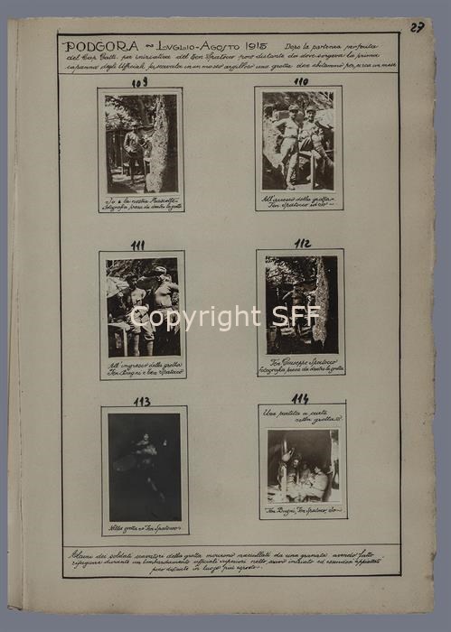 Soldati della 7ª Batteria Someggiata ritratti nei momenti di vita quotidiana negli accampamenti militari sul Monte Calvario [Podgora] nell'estate del 1915, nel ricovero recuperato nello scavo di una galleria poco distante da dove sorgeva la prima capanna degli ufficiali, il Ten. Oreste Bugni assieme ai sui compagni visse per più di un mese.