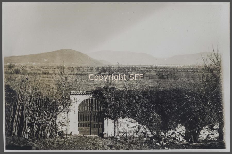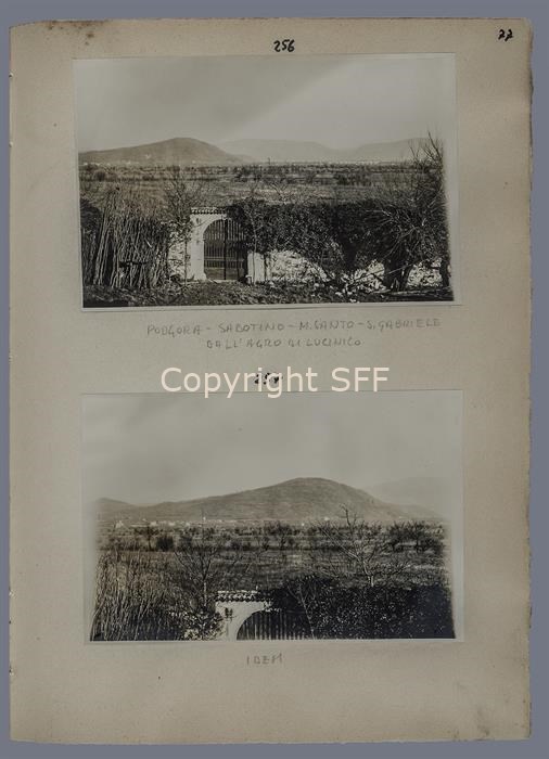 Veduta dei monti: Calvario [Podgora], Sabotino, Santo e San Gabriele ripresi dalle campagne di Lucinico. A destra si distinguono le arcate del ponte della “ferrovia Meridionale”