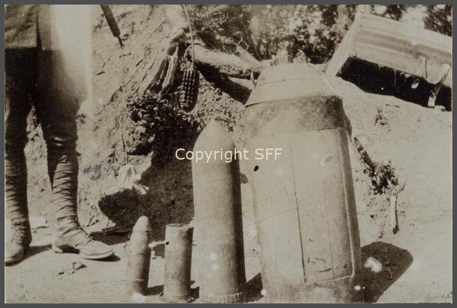 Sequenza di ordigni, proiettili, bombe e barilotti austriaci ritrovati dai soldati sul Monte Calvario [Podgora] nell'estate del 1915