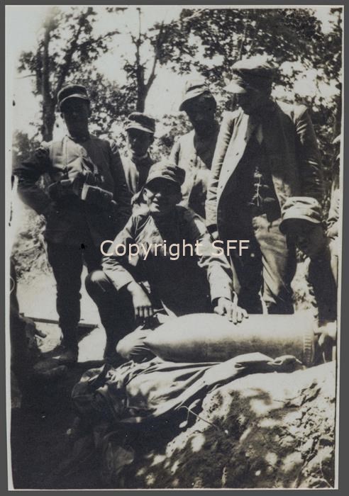 Gruppo di soldati attorno ad una bomba austriaca ritrovata sul Monte Calvario [Podgora] nell'estate del 1915