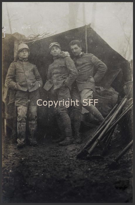Gruppi di militari ripresi in prima linea presso la grande capanna del Genio in un giorno di fitta e umida nebbia sul Monte Calvario [Podgora] nel mese di novembre del 1915. L'ufficiale al centro è il Ten. Berni del Genio.