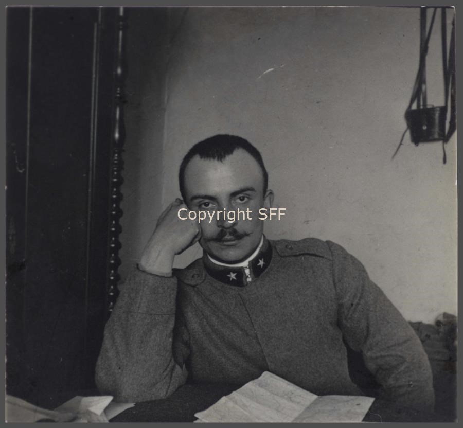 Ritratto a mezzo busto del capitano Oreste Bugni in uniforme, seduto dietro ad un tavolino, inverno 1916 a Capriva