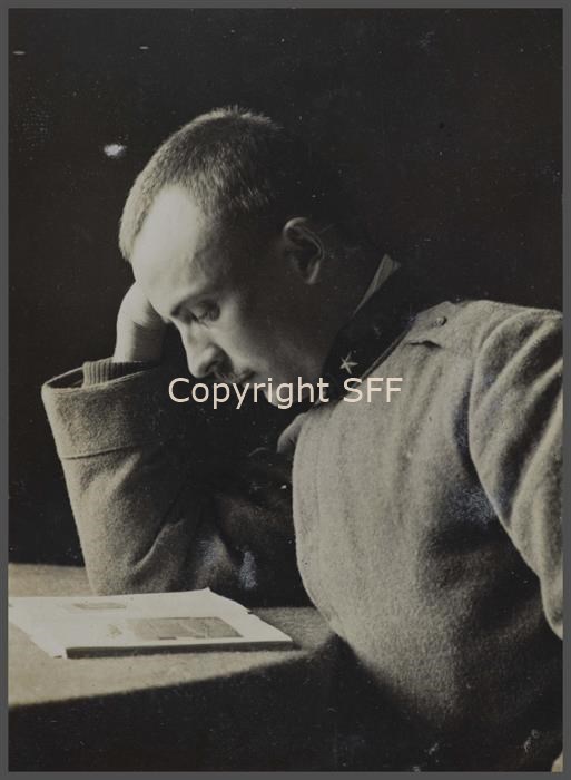 Ritratto a mezzo busto del capitano Oreste Bugni in uniforme, seduto mentre legge, inverno 1916 a Capriva