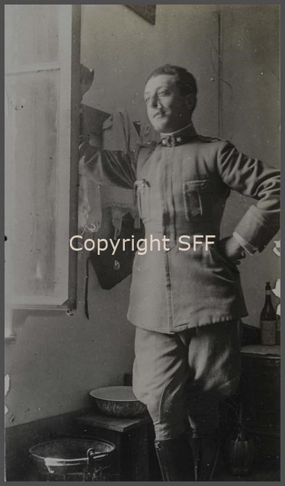 Ritratto in interno di un ufficiale in uniforme ripreso in piedi accanto ad una finestra, inverno 1916 a Capriva
