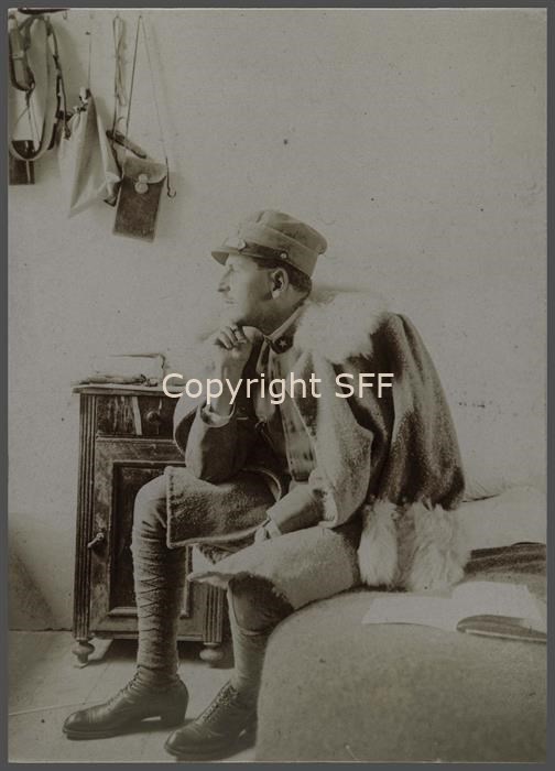 Ritratto in interno del S. Tenente XXX in uniforme con il cappotto seduto sul letto, inverno 1916 a Capriva