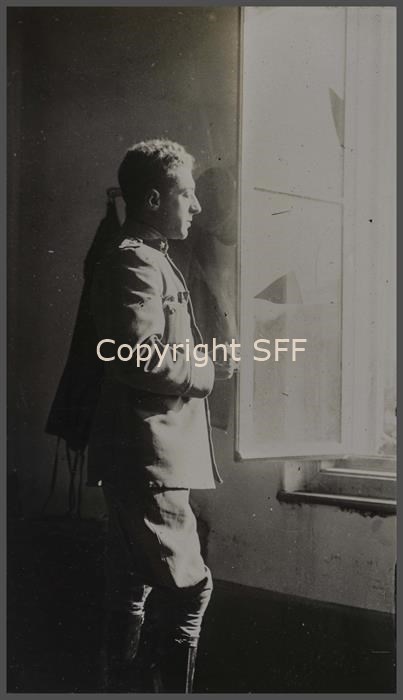 Ritratto in interno di un sottotenente in uniforme in piedi accanto ad una finestra, inverno 1916 a Capriva