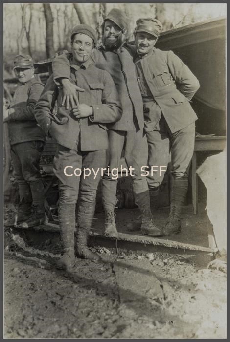 Ritratto di un gruppo di soldati: S. Tenenete Dowen del Genio zappatori, ucciso pochi giorni dopo da bomba a mano, il S. Tenente Medico del 36° fanteria e il S. Tenenete Filippo Serafini del 35° fanteria. Il ritratto di gruppo è stato eseguito tra ottobre e dicembre 1915 sul Podgora, durante il periodo in cui si sono svolte le offensive conosciute anche come la terza e la quarta battaglia dell’Isonzo. Le cosiddette battaglie autunnali si combatterono rispettivamente tra il 18 ottobre ed il 4 novembre, e tra il 10 novembre ed il 2 dicembre.