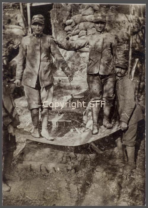Il Serg. Viganò e il Serg. Trinchieri ripresi mentre assieme ad altri militari si trovano all'esterno di una baracca dell'accampamento (7ª Batteria Someggiata) sul Monte Calvario [Podgora] durante l'estate del 1915.