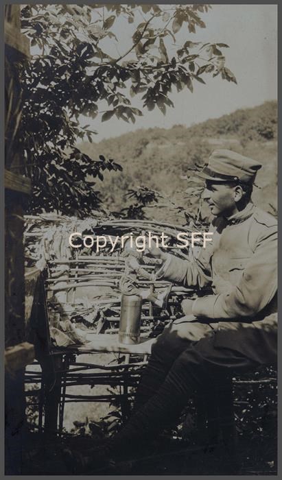Io (S. Ten. XXX ) e il fantoccio-mascotte. Scatti di vita quotidiana dalla prima linea presso Gradiscutta sulle alture antistanti al Podgora (sinistra di Q. 240) dove la 7ª Batteria nel settembre del 1915 si trasferisce occupando le posizioni lasciate dalla batteria someggiata del capitano Marchionni.