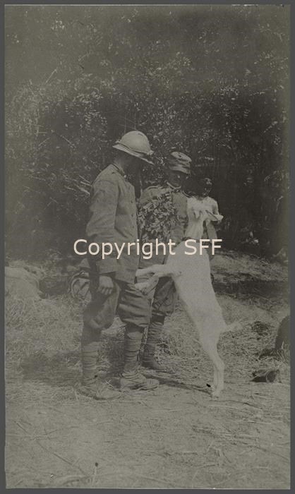 Soldati ritratti assieme ad una capra in un accampamento di retrovia.
