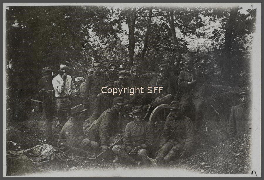 Ritratto di gruppo di soldati dalla 7^ Batteria assieme al loro comandante il tenente Oreste Bugni in maniche di camicia accanto ad un cannone da 70 mm. Lo scatto è stato eseguito sulle colline antistanti il Monte Calvario [Podgora] prima che iniziassero i combattimenti.