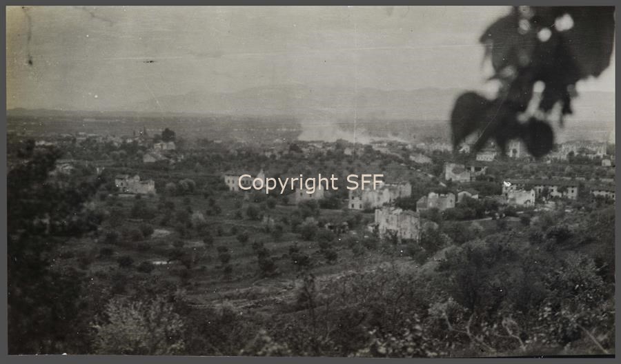 Veduta della pianura con edifici danneggiati e sullo sfondo il Carso. Al centro dell’immagine è ritratto un vasto incendio.