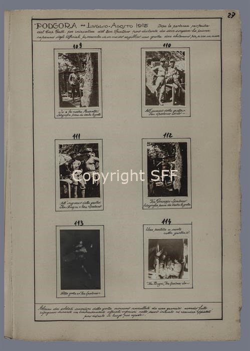 Ritratto del Ten.te Giuseppe Spatocco ripreso dall'interno della galleria scavata poco distante da dove sorgeva la prima capanna degli ufficiali degli accampamenti militari della 7ª Batteria Someggiata sul Monte Calvario [Podgora] nell'estate del 1915.