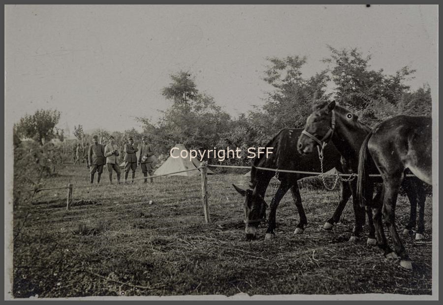 Scatti di vita quotidiano nelle retrovie. La 7ª Batteria nel settembre del 1915 si trasferisce in località San Andrat del Judrio (oggi in comune di Corno di Rosazzo), in accampamenti allestiti con tende lungo le rive del torrente Iudrio. In primo piano tre cavalli.