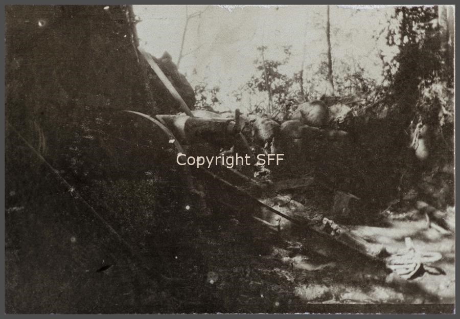 Un cannone da 70 mm da montagna, nell’appostamento di prima linea a poca distanza dal nemico, motivo per cui fu messo in posizione senza lo scudo protettivo, sul Monte Calvario [Podgora] durante l'estate del 1915.