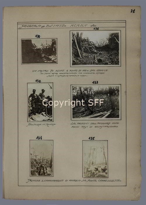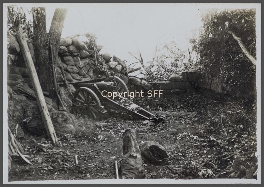 Un cannone da 70 mm da montagna, nell’appostamento di prima linea a poca distanza dal nemico, motivo per cui fu messo in posizione senza lo scudo protettivo, sul Monte Calvario [Podgora] durante l'estate del 1915.