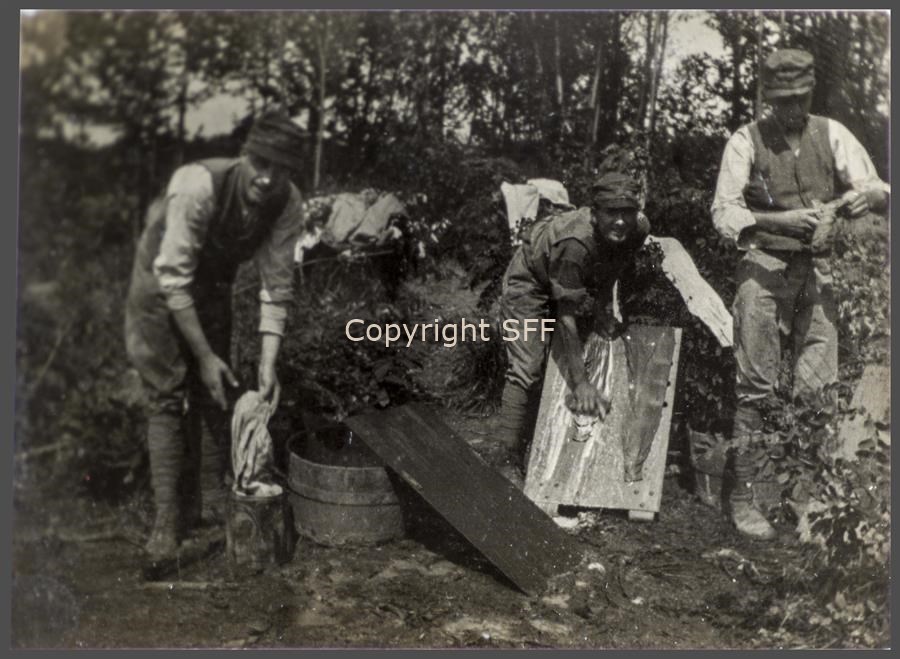 Sandron, Appiani e Stocco ripresi mentre stanno facendo il bucato nell'accampamento della (7ª Batteria Someggiata) sul Monte Calvario [Podgora] durante l'estate del 1915.
