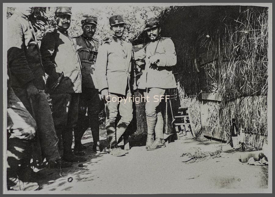 Ritratto di gruppo in occasione della visita del S.T. Med. Tricerri, futuro cognato di Bugni. Scatti di vita quotidiana dalla prima linea presso Gradiscutta sulle alture antistanti al Podgora (sinistra di Q. 240) dove la 7ª Batteria nel settembre del 1915 si trasferisce occupando le posizioni lasciate dalla batteria someggiata del capitano Marchionni.