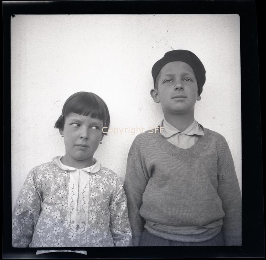 Ritratto in posa frontale di una bambina con abito fiorito e orecchini con accanto un bambino con il cappello. Sono ripresi in piedi davanti ad un muro.