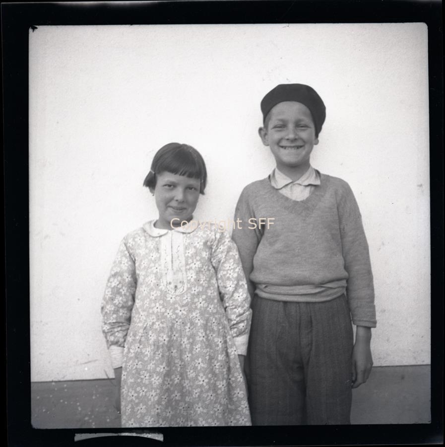 Ritratto in posa frontale di una bambina con abito fiorito e orecchini con accanto un bambino con il cappello. Sono ripresi in piedi davanti ad un muro.
