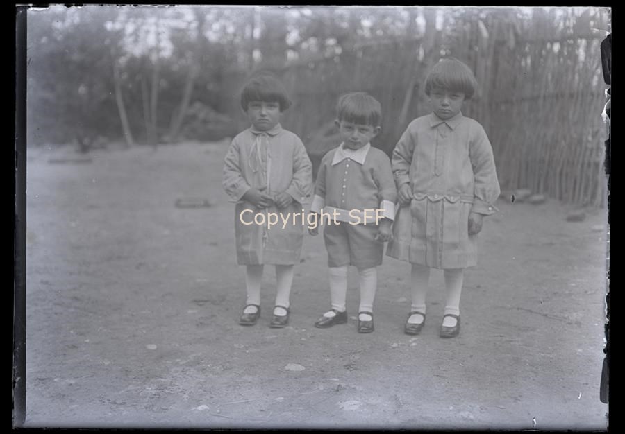 Ritratto di gruppo di tre bambini componenti della famiglia dell'informatore di Pellis a Pozzoleone, ripresi in esterno a figura intera: sullo sfondo si notano alberi e un recinto in legno