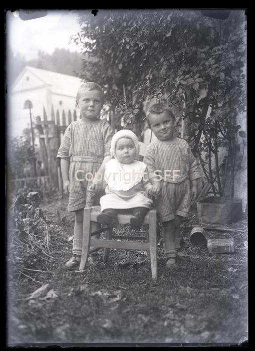 Ritratto di tre bambini Dal Don, ripresi a figura intera in un cortile. Il bambino più piccolo è seduto su una sedia. Sullo sfondo una chiesa
