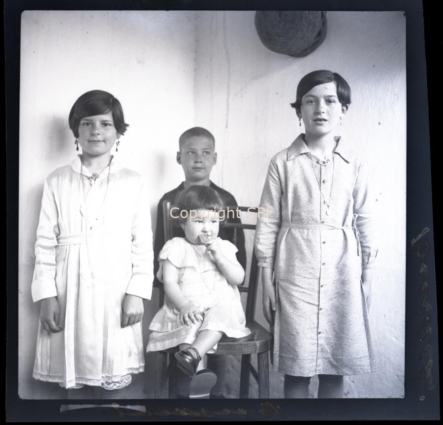 - Ritratto di un gruppo di bambini a figura intera. Quattro bambini (tre bambine e un bambino), la più piccola è seduta su una sedia; gli altri sono in piedi dietro o a fianco di lei. La foto è stata scattata in un ambiente domestico. Appeso al muro si intravvede un cesto.