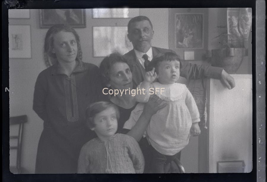 Ritratto di gruppo della famiglia Carletti, comprendente tre adulti e due bambini. La foto è stata scattata in ambiente domestico