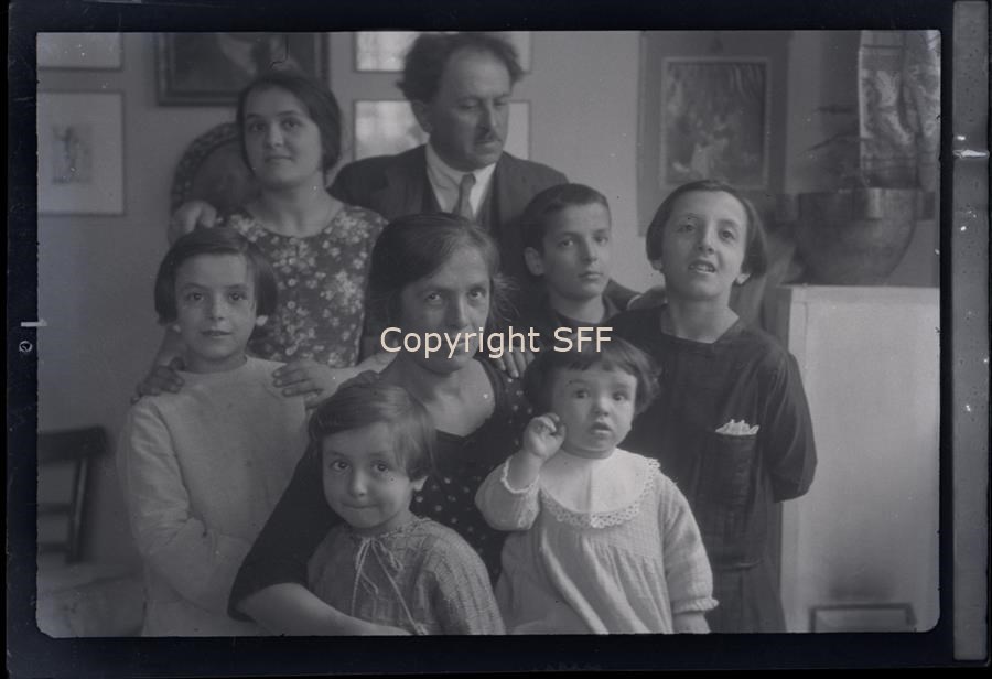 Ritratto di gruppo della famiglia Carletti, comprendente otto persone, tre adulti e cinque bambini. La foto è stata scattata in ambiente domestico