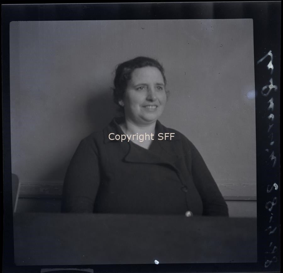 Ritratto a mezzo busto di Nelda Pellis ripresa seduta accanto ad un tavolo in un ambiente domestico