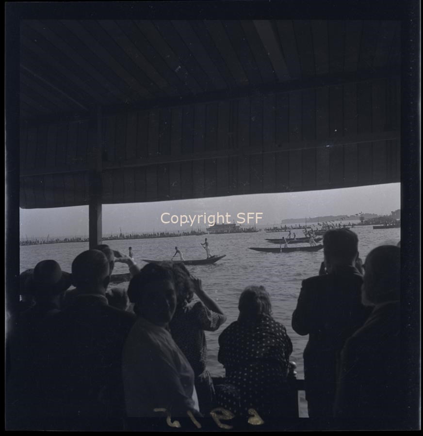 Fotografia scattata durante una Regata Storica a Venezia lungo il Canal Grande. In primo piano si vedono alcune persone del pubblico (tra cui Nelda Pellis), appostate sotto una tettoia. Sullo sfondo si vedono il mare e le imbarcazioni che gareggiano