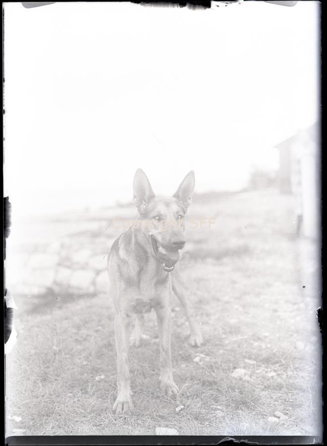 - Ritratto del cane Reno, ripreso frontalmente, dietro di lui si intravede un paesaggio rurale con alcune abitazioni sulla destra nei pressi del paese [Tartinia] Tertenia