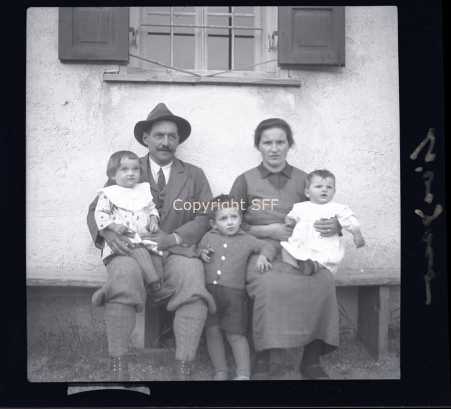 - Ritratto di una famiglia comprendente il padre, la madre e i tre figli in tenera età. I genitori sono seduti su una panca a ridosso di un edificio e tengono in braccio un bambino ciascuno. Il terzo figlio è in piedi tra i genitori