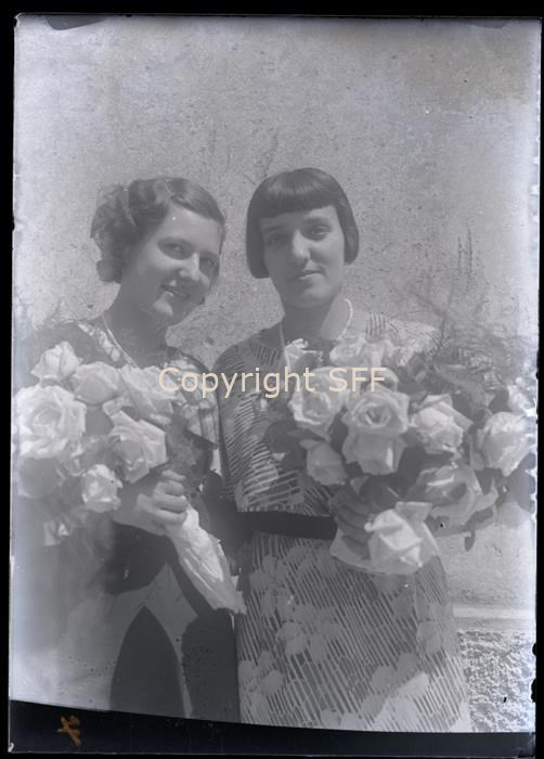 Ritratto di due donne a mezza figura, Maria Segalla. mentre quella di destra è Nelda Pellis. Entrambe, partecipano ad un matrimonio e tengono in mano un mazzo di rose bianche