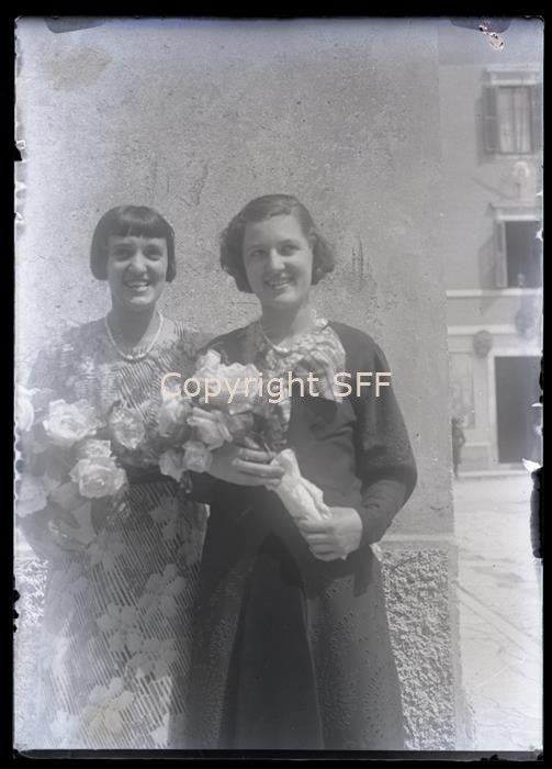 Ritratto di due donne a mezza figura, Maria Segalla mentre quella di sinistra è Nelda Romano in Pellis. Entrambe, partecipano ad un matrimonio e tengono in mano un mazzo di rose bianche